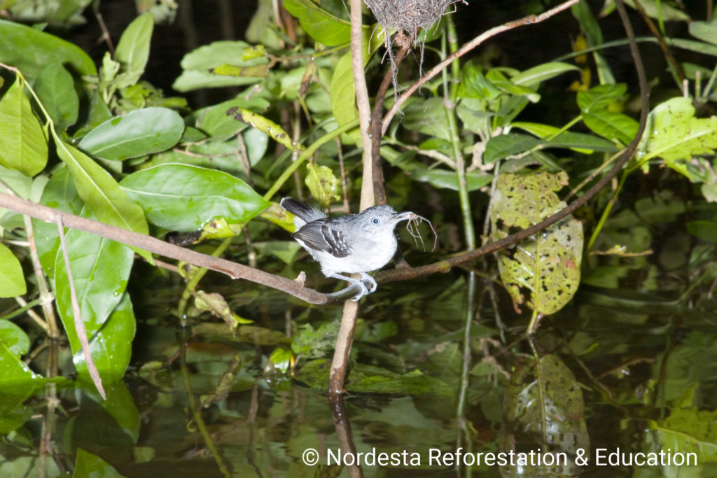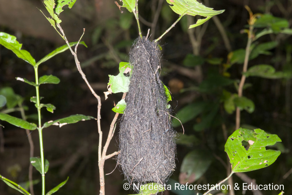 Nests are not reused but are rebuilt nearby, often in the same tree. Some are made with fine black fibres and aerial roots from vine species. We found these nests were primarily placed in low shrubs over water, usually around 18 cm above the surface.