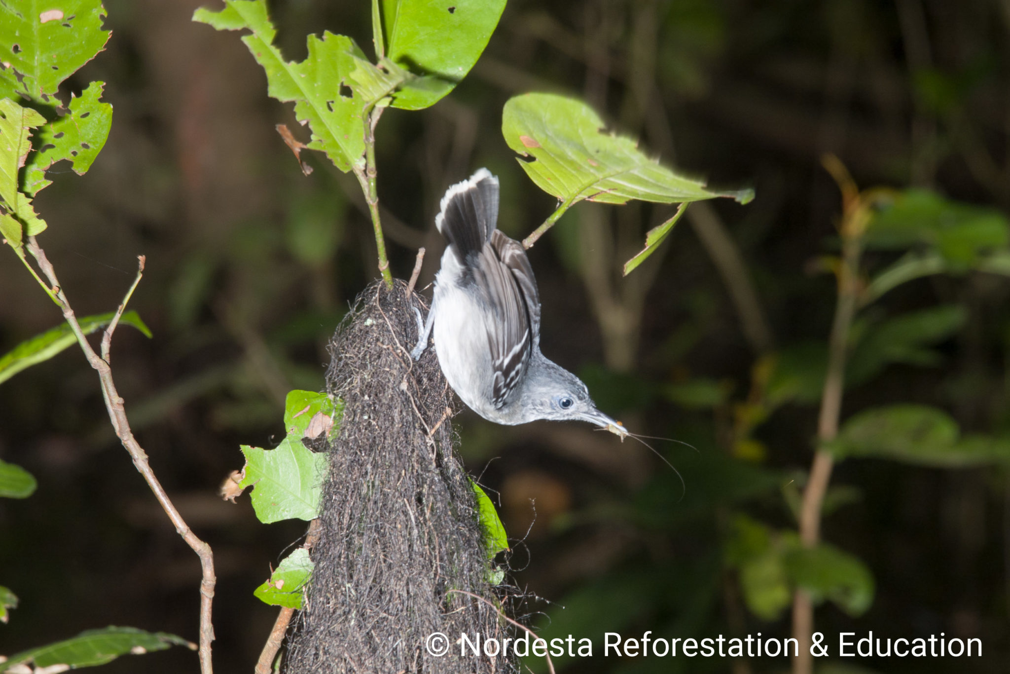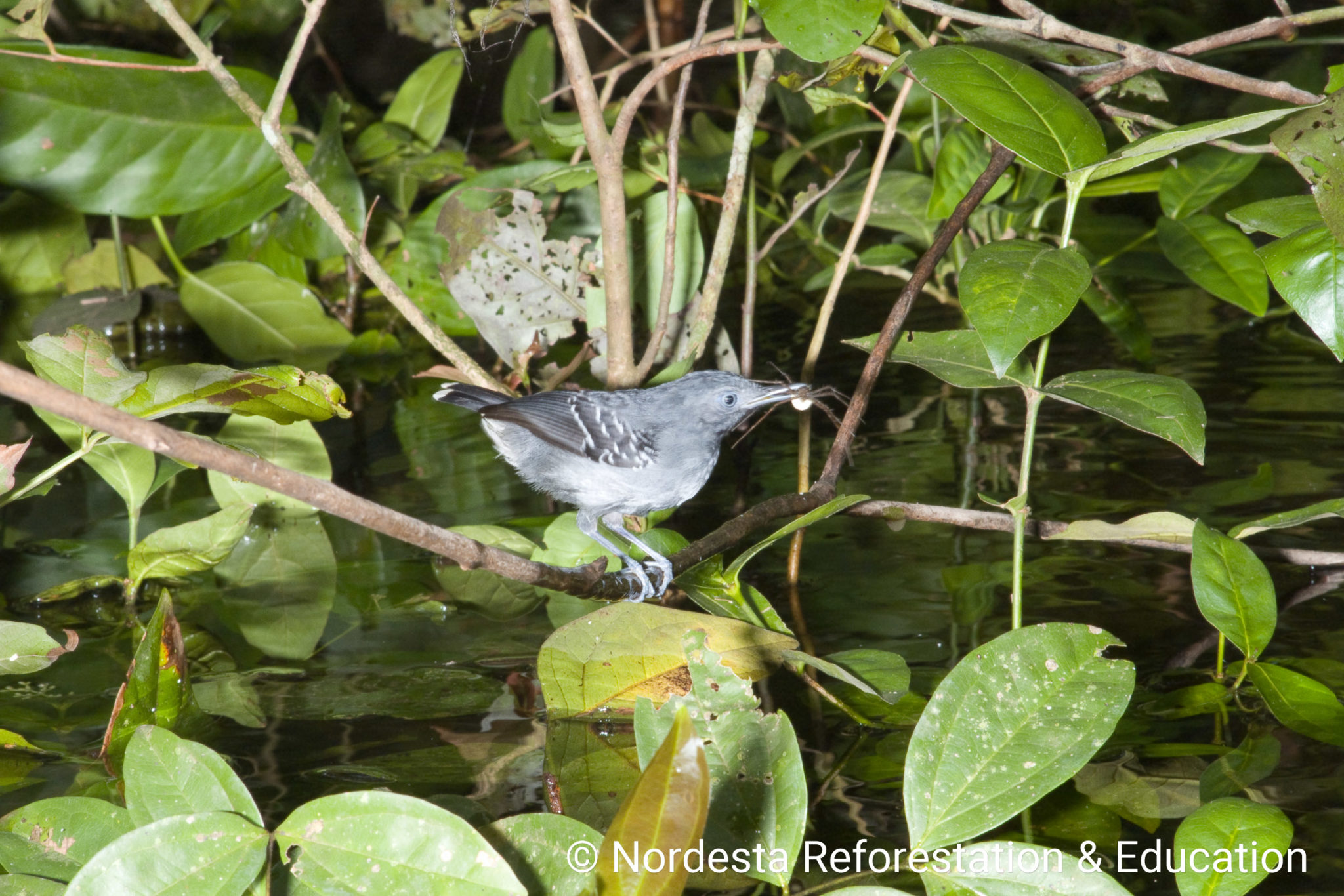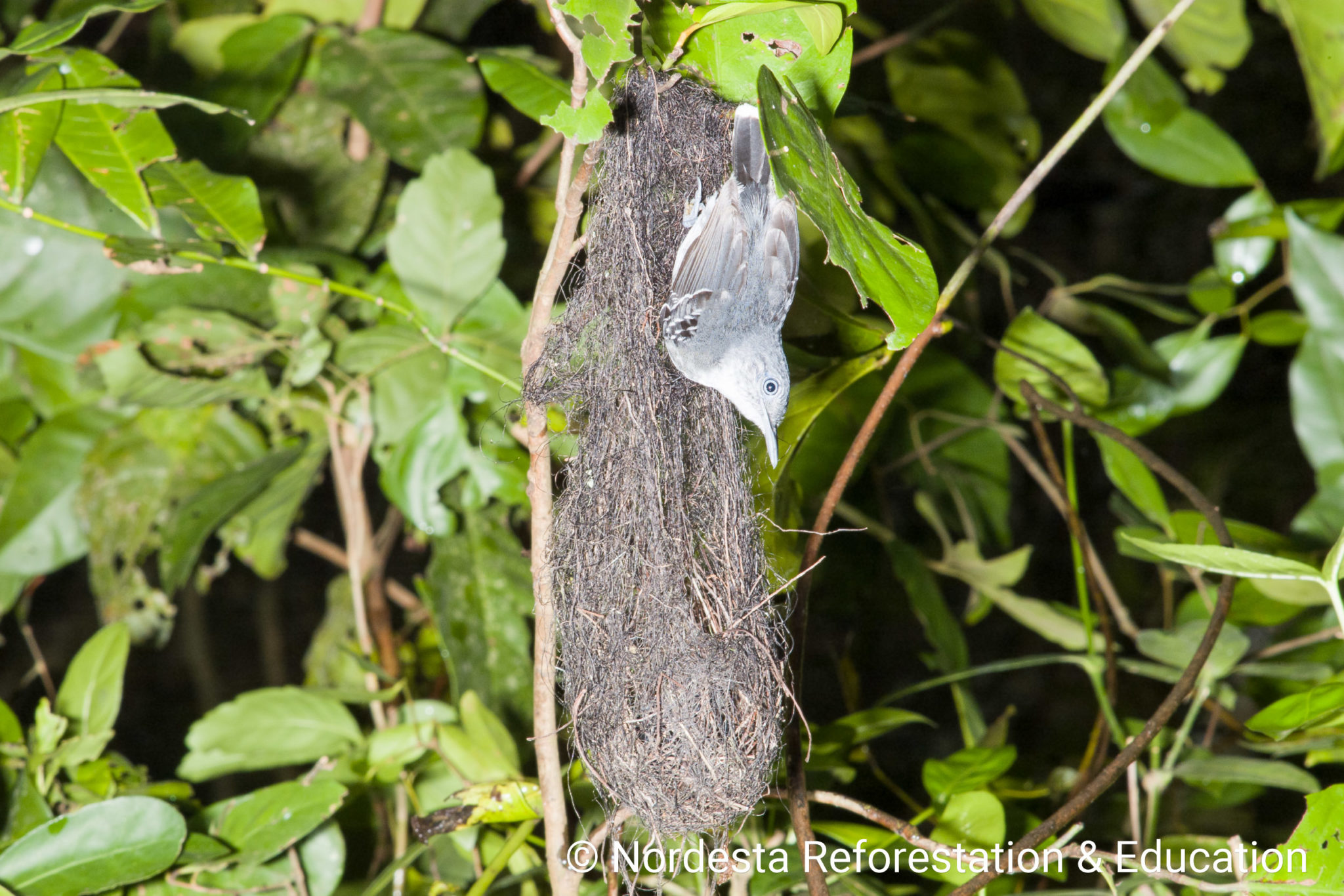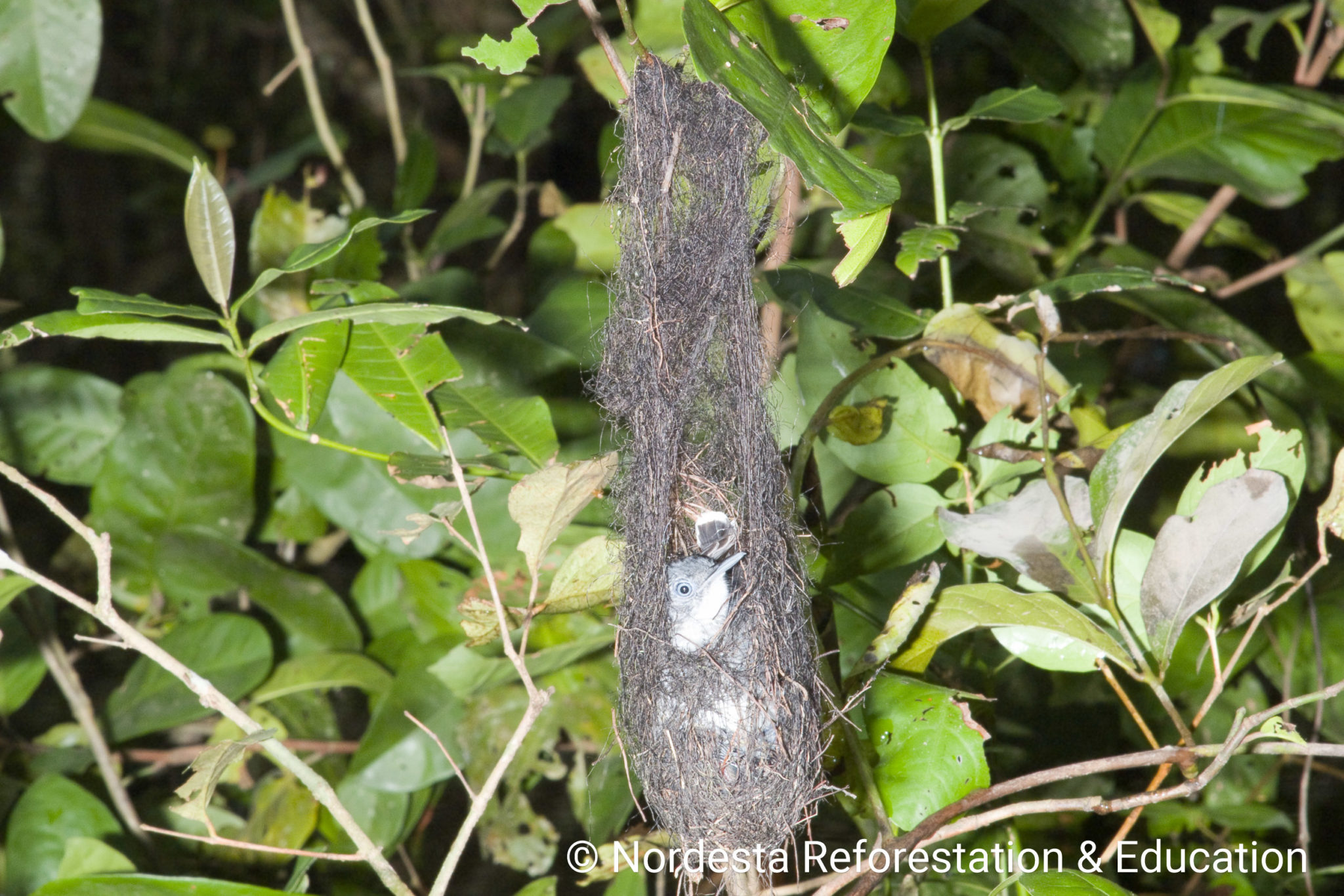 Nests are not reused but are rebuilt nearby, often in the same tree. Some are made with fine black fibres and aerial roots from vine species. We found these nests were primarily placed in low shrubs over water, usually around 18 cm above the surface.
