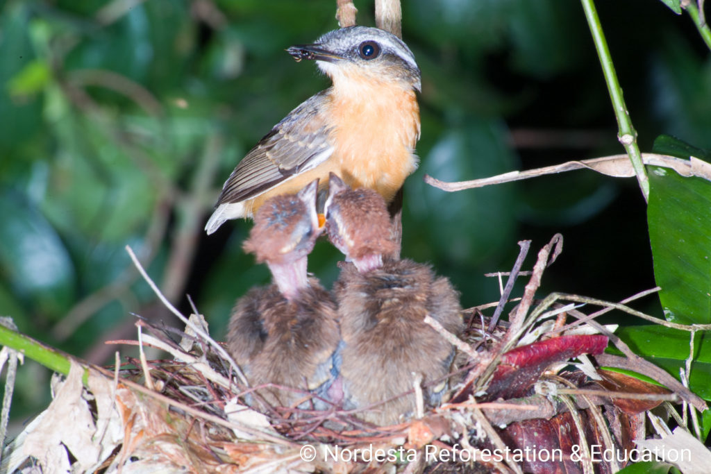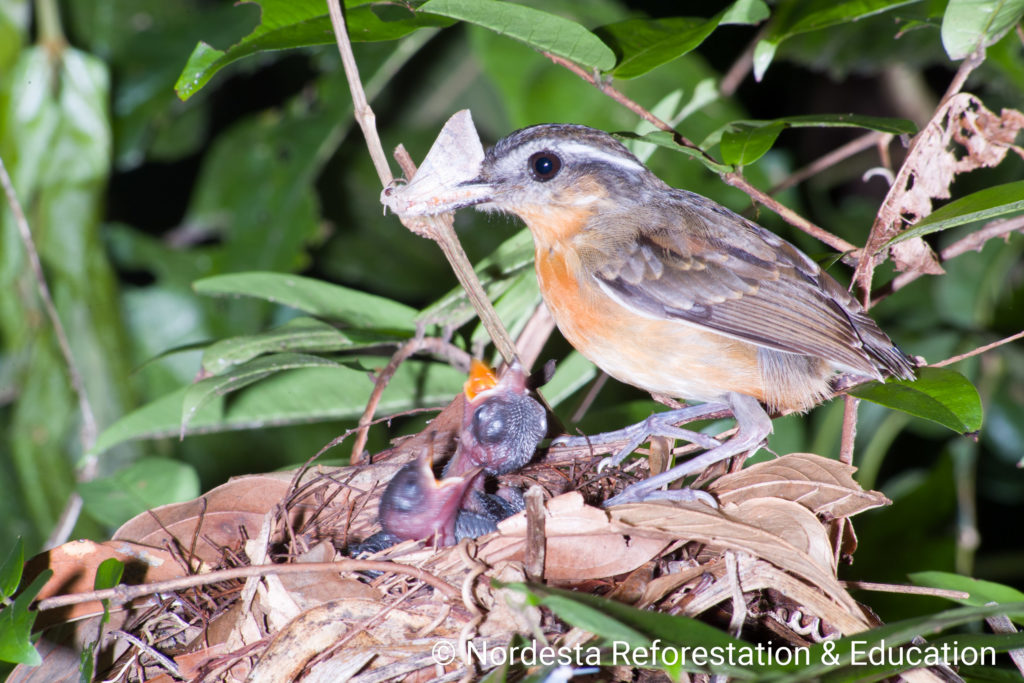 The nest is a well-crafted, shallow cup made from smooth twigs, thin vines, black fungal threads, and dry leaves. The interior is carefully lined with fine stems and roots. Nests are usually placed low to the ground—between 0.5 to 1 meter—often in the fork of a bush, a pile of dry branches, or the broken trunk of a small tree.