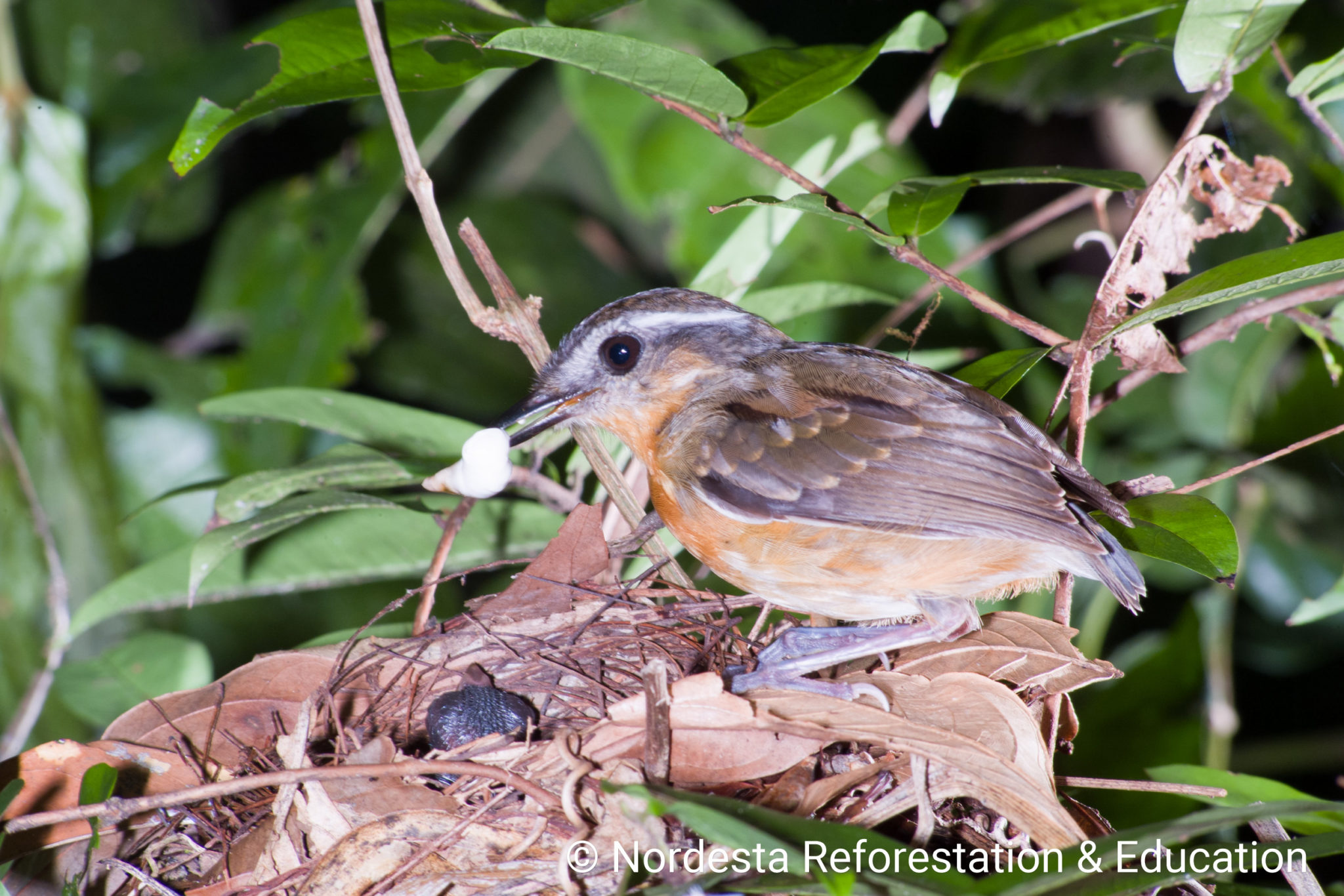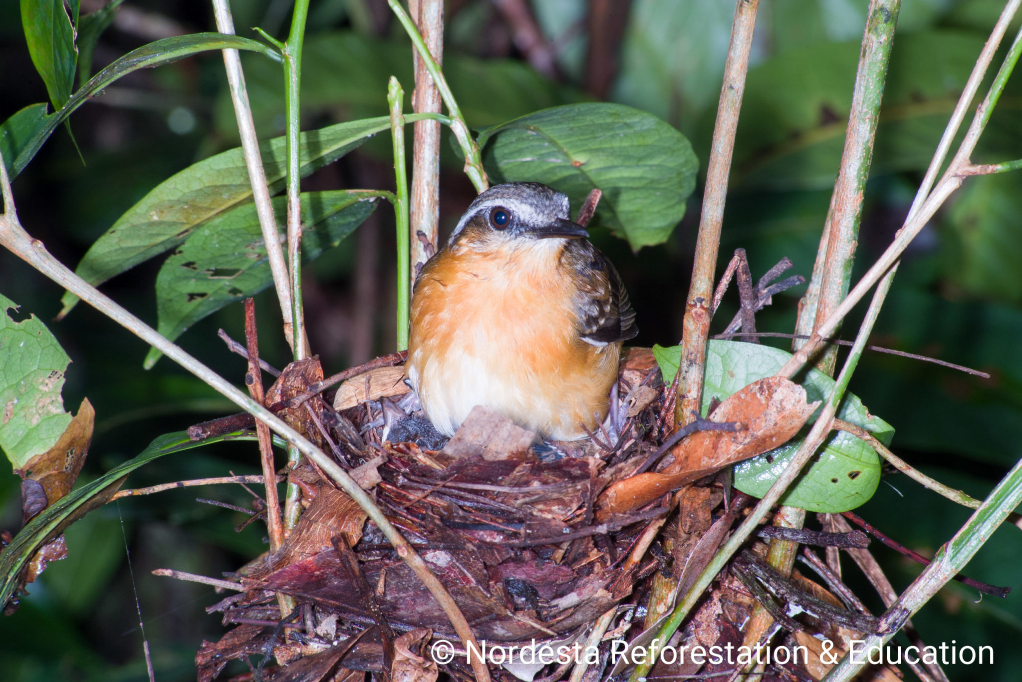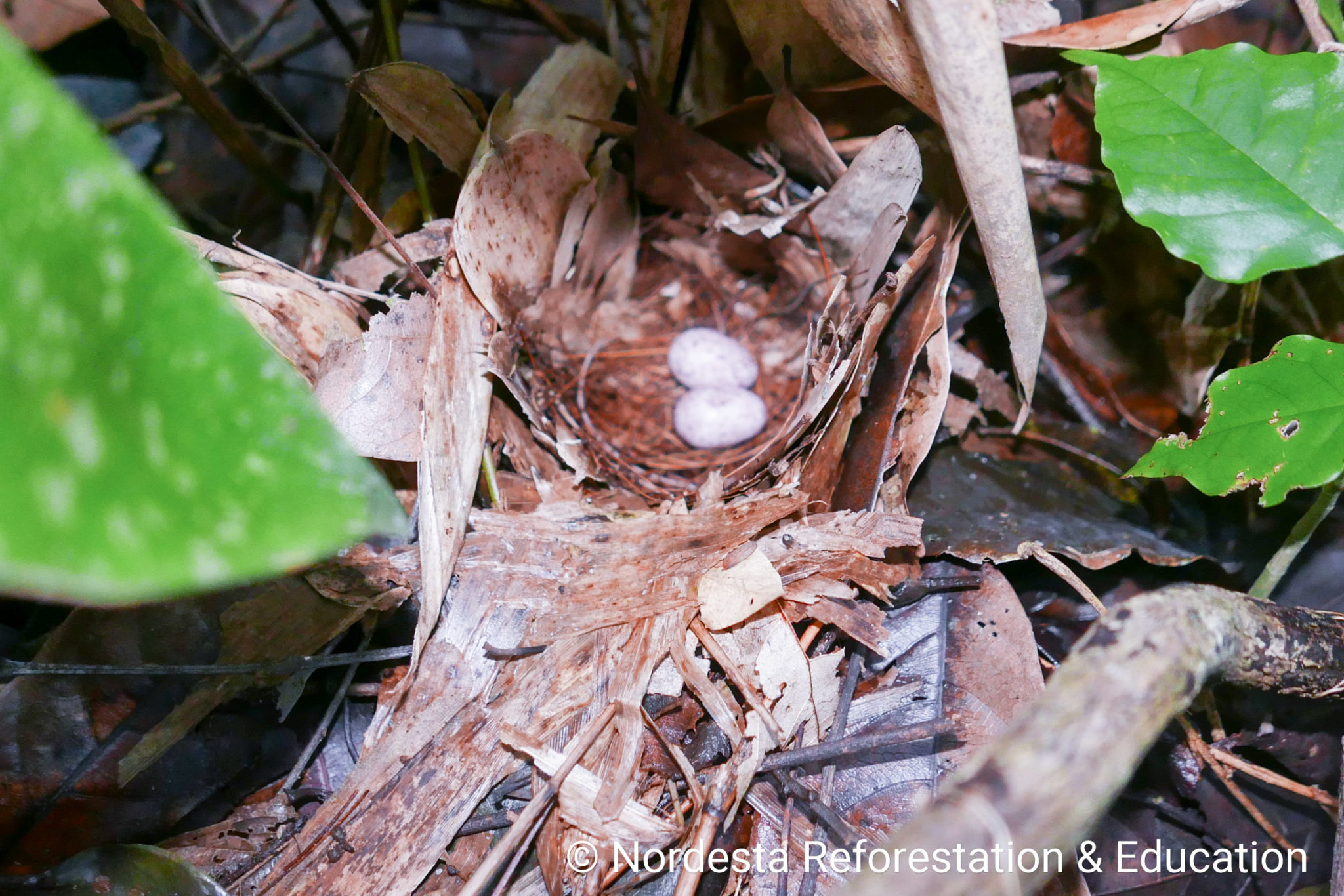 The nest is a well-crafted, shallow cup made from smooth twigs, thin vines, black fungal threads, and dry leaves. The interior is carefully lined with fine stems and roots. Nests are usually placed low to the ground—between 0.5 to 1 meter—often in the fork of a bush, a pile of dry branches, or the broken trunk of a small tree.