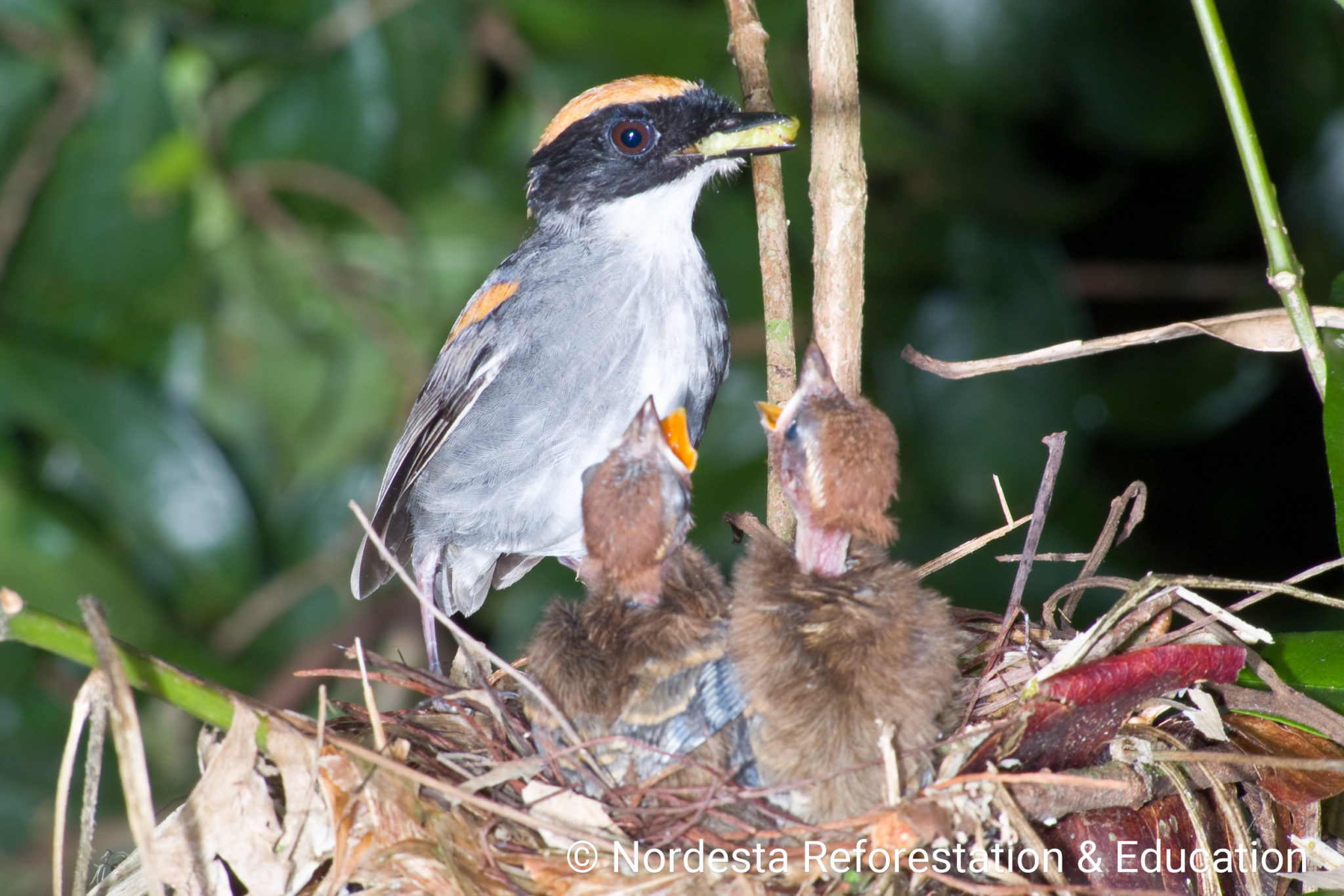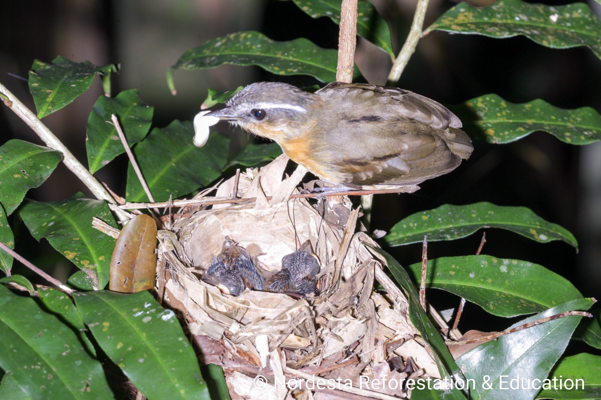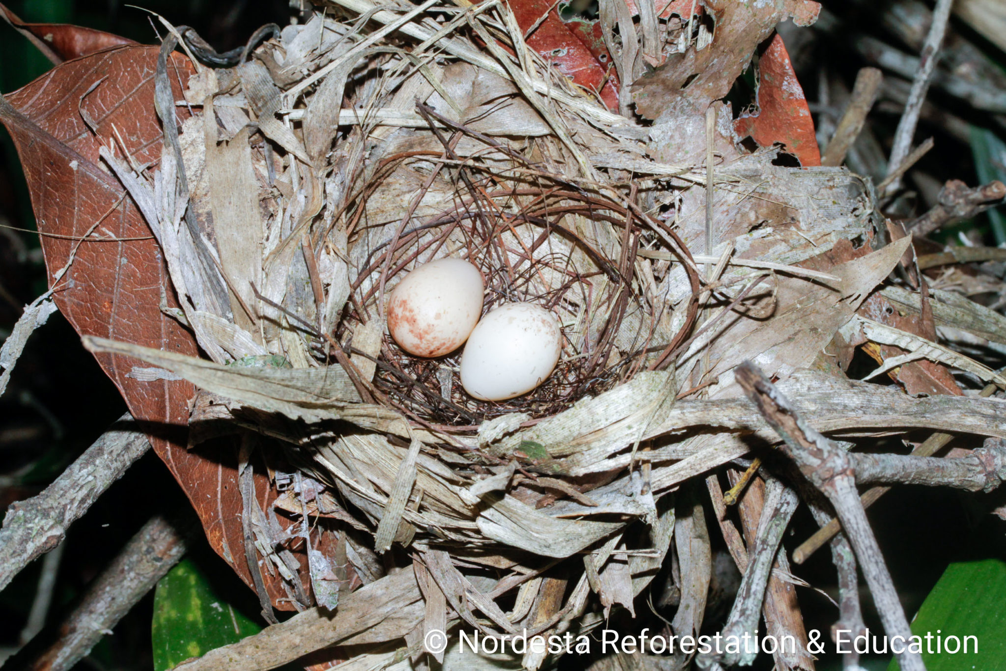 The nest is a well-crafted, shallow cup made from smooth twigs, thin vines, black fungal threads, and dry leaves. The interior is carefully lined with fine stems and roots. Nests are usually placed low to the ground—between 0.5 to 1 meter—often in the fork of a bush, a pile of dry branches, or the broken trunk of a small tree.