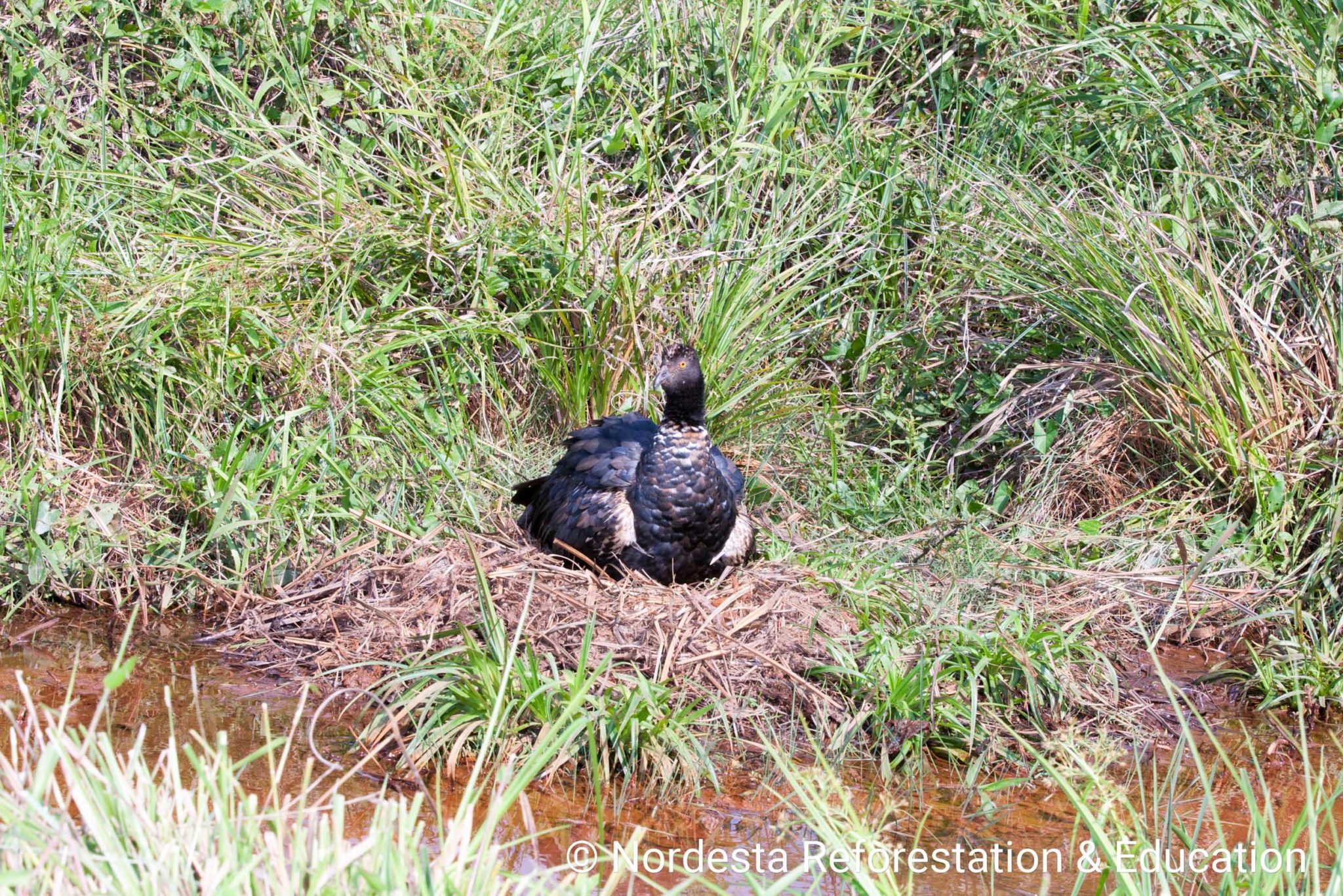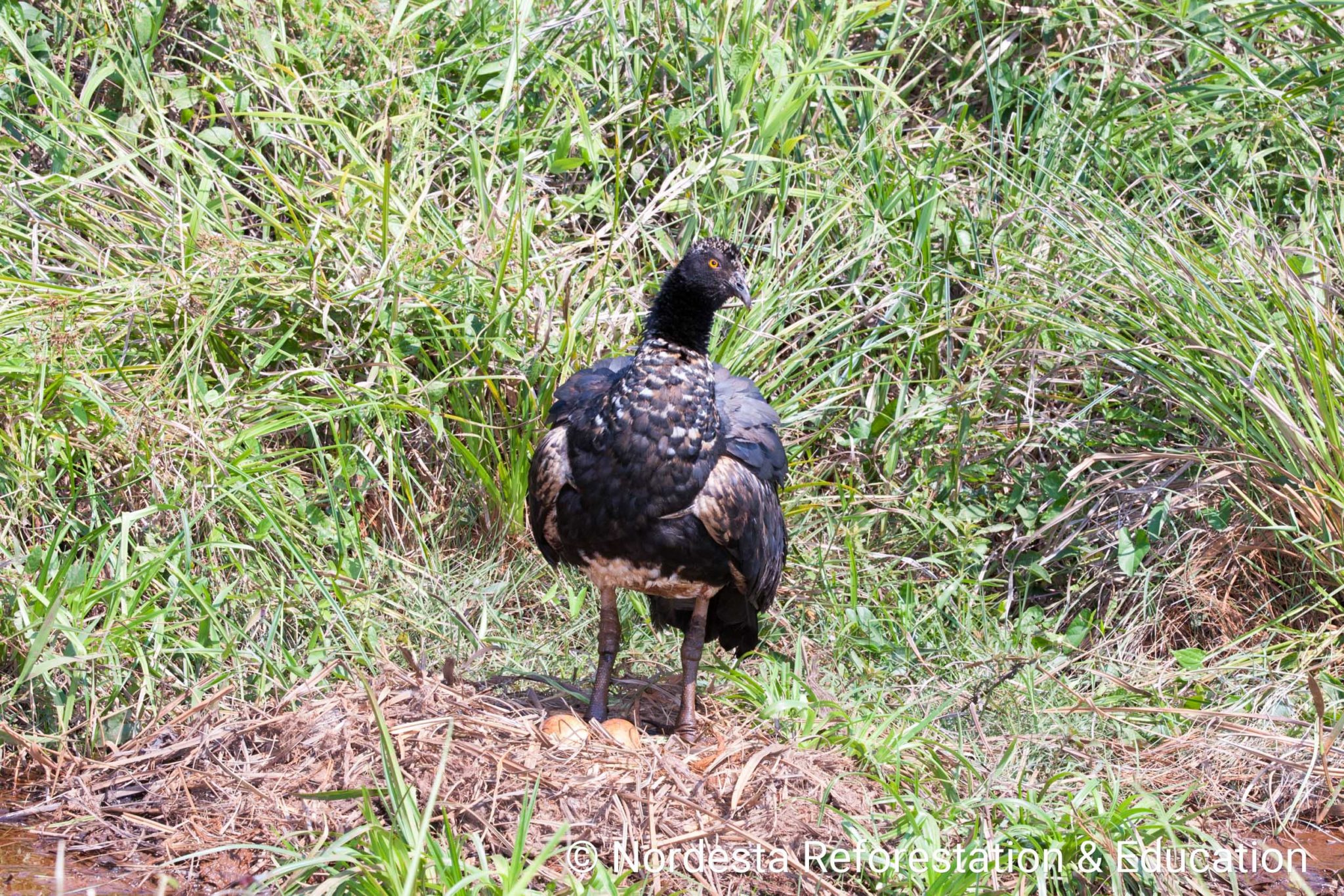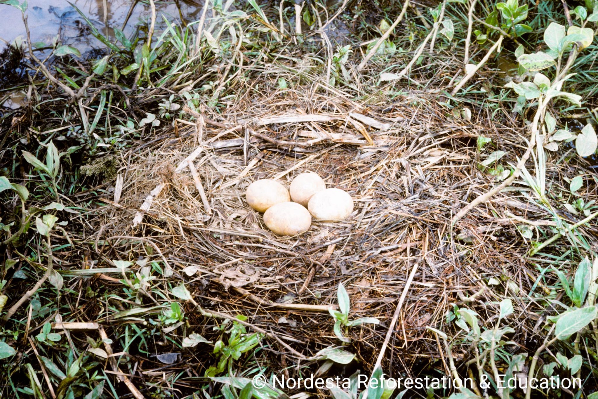 The nests are built on the ground near water using plant materials like grass, Cyperus, and Typha. Often, green leaves and other vegetation from the surroundings are included. Although Anhima cornuta nests have been described as floating, our observation of a flooded nest with three eggs suggests they do not float.