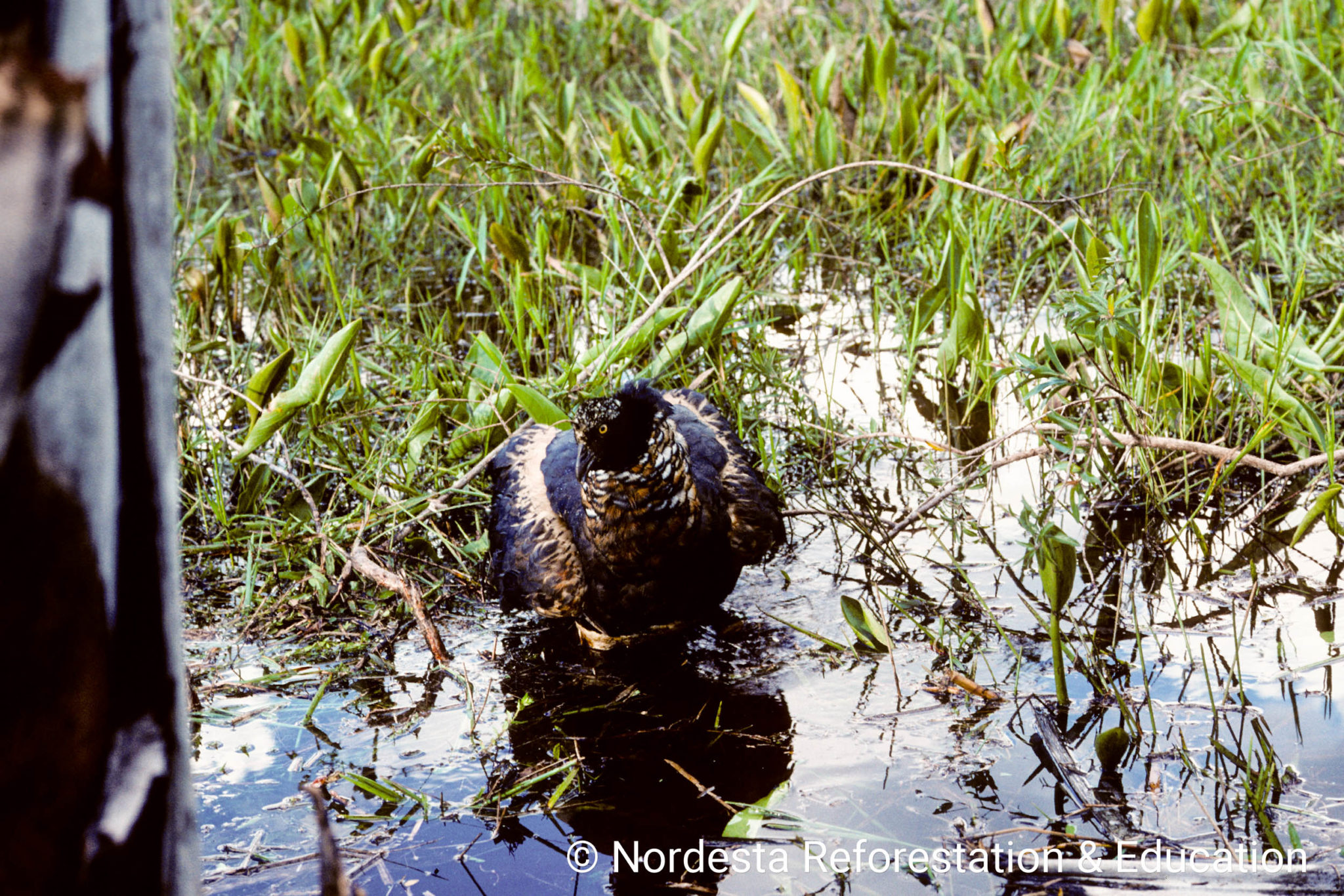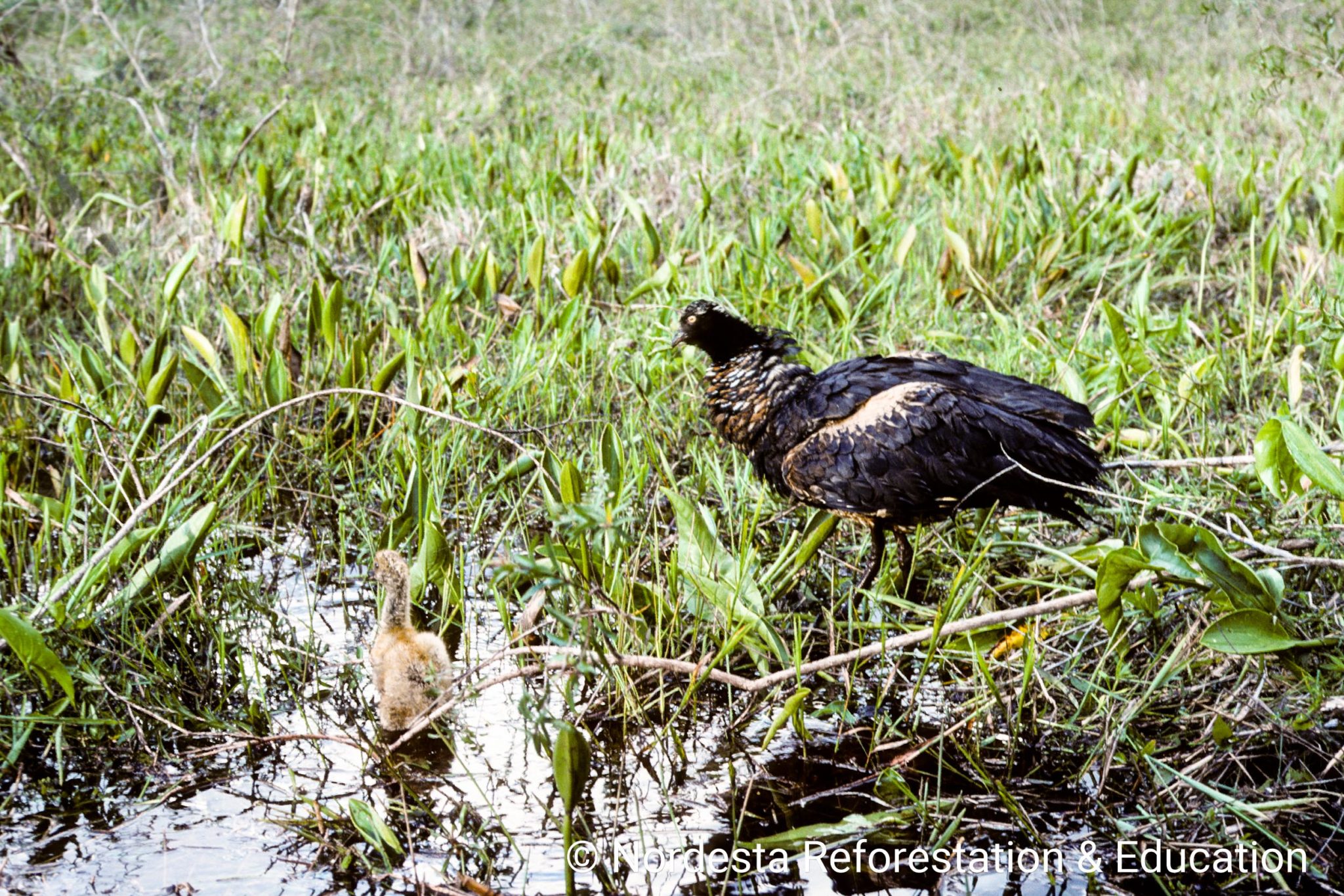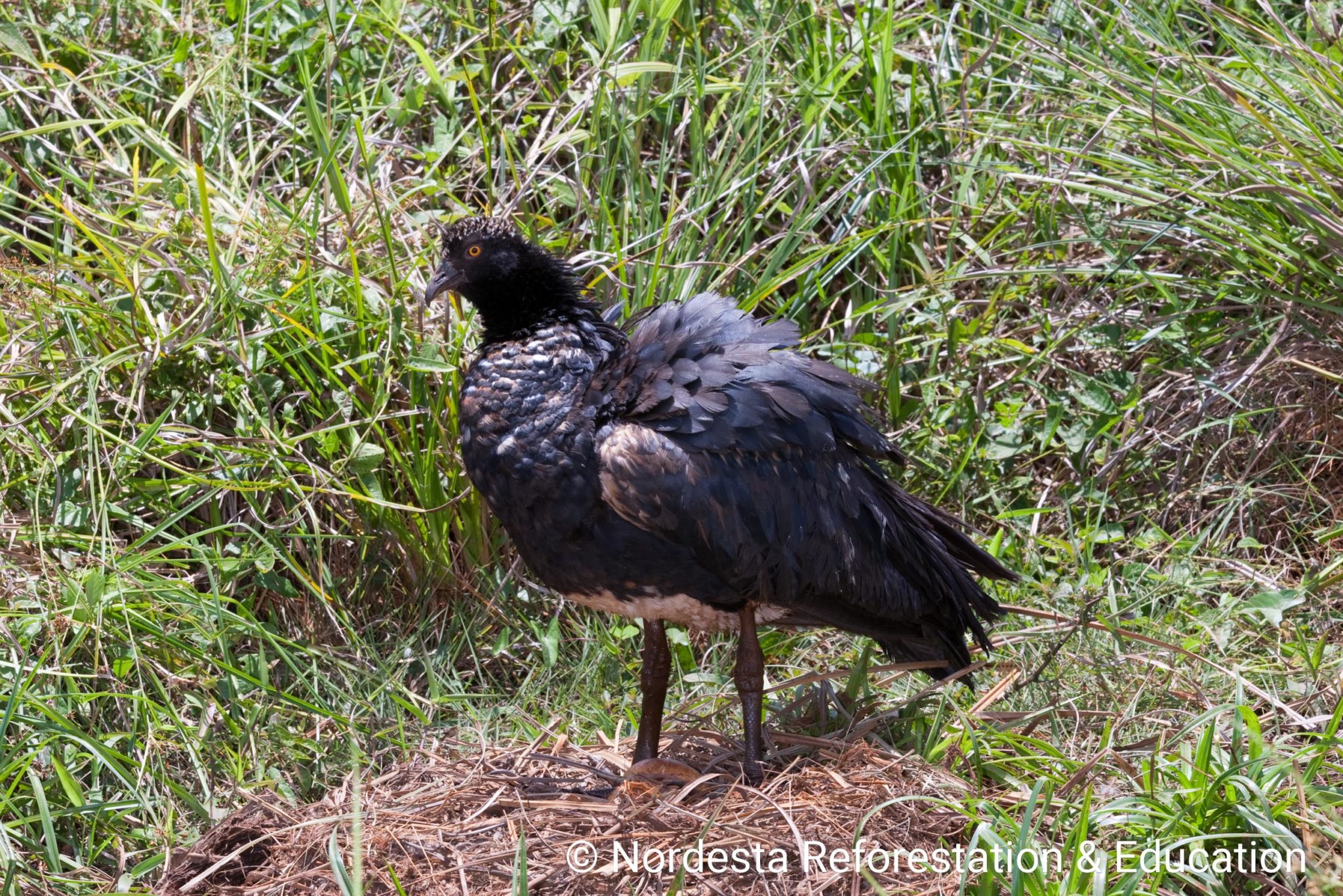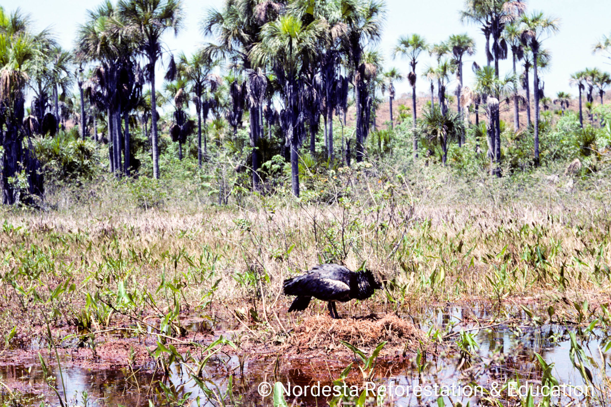 The nests are built on the ground near water using plant materials like grass, Cyperus, and Typha. Often, green leaves and other vegetation from the surroundings are included. Although Anhima cornuta nests have been described as floating, our observation of a flooded nest with three eggs suggests they do not float.