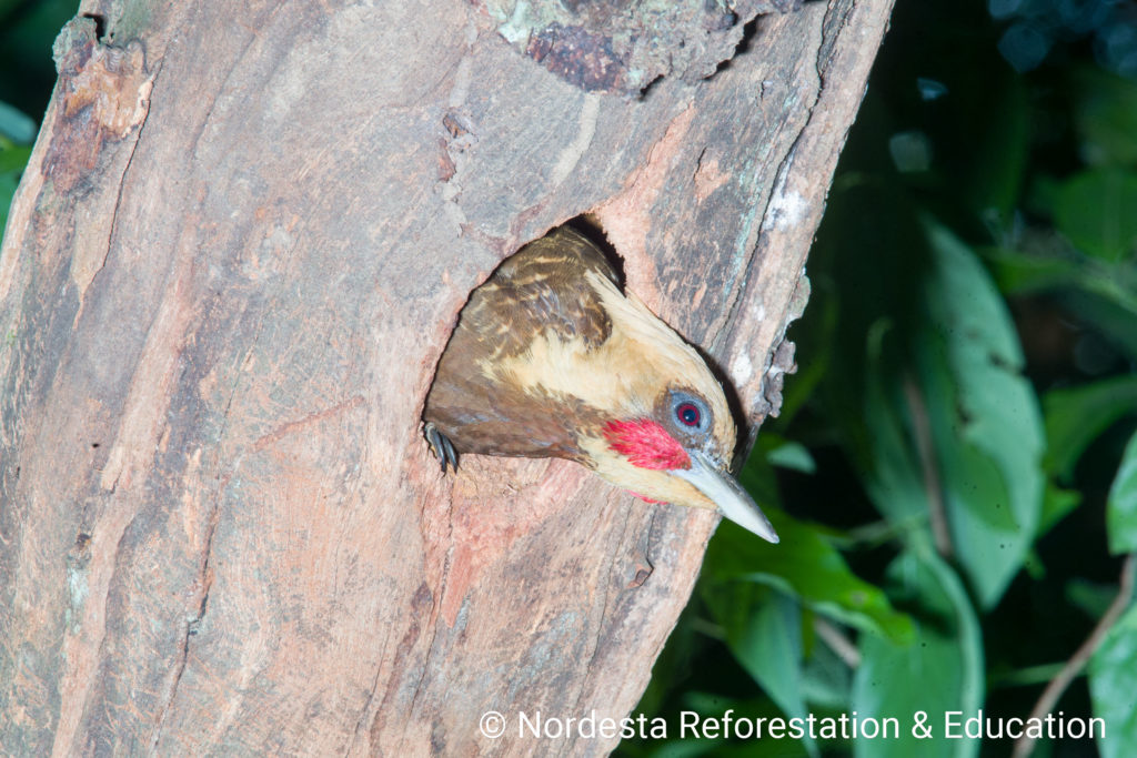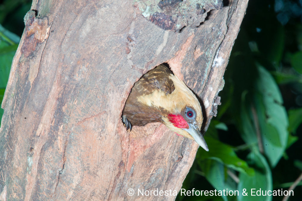This woodpecker is typically seen alone but can occasionally be observed in pairs or small family groups. It stays close to lower vegetation layers, flying low and avoiding open areas. Its presence is usually noticed through its distinctive loud call, consisting of two to four repeated phrases. Its diet consists mostly of ants and termites found on trees, though it also eats fruits and berries. During the breeding period, both parents feed the young with insects and larvae, carefully observing the surroundings before entering the nest.