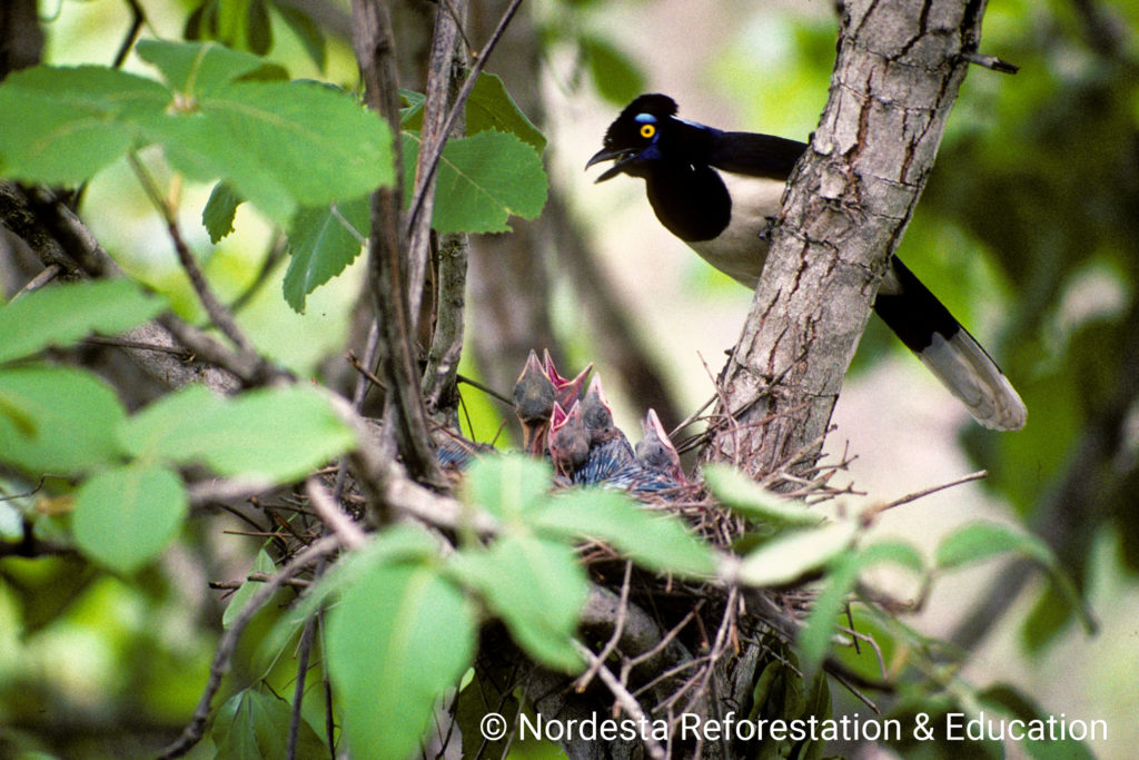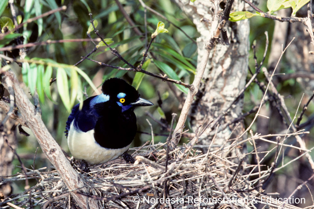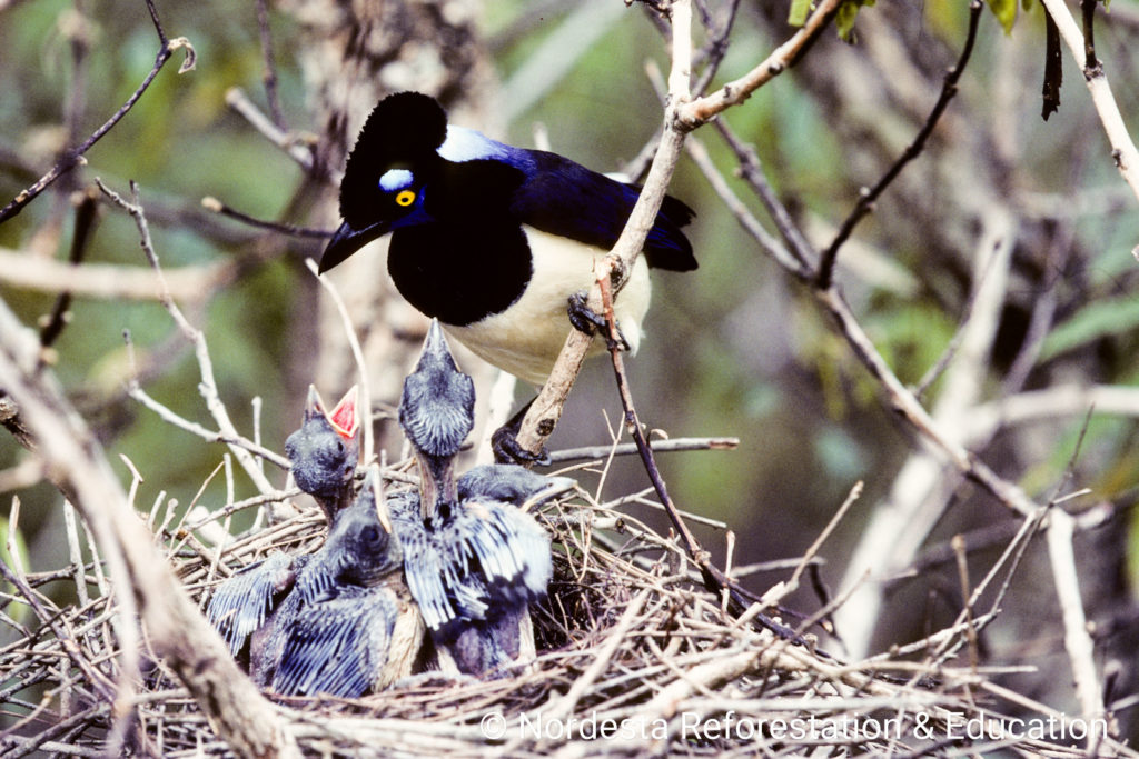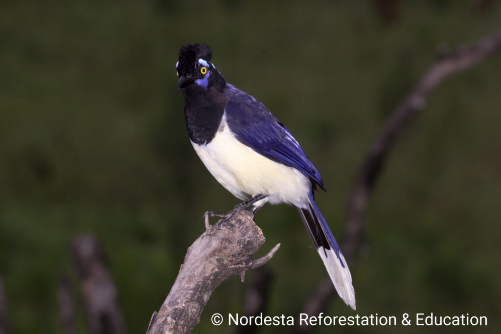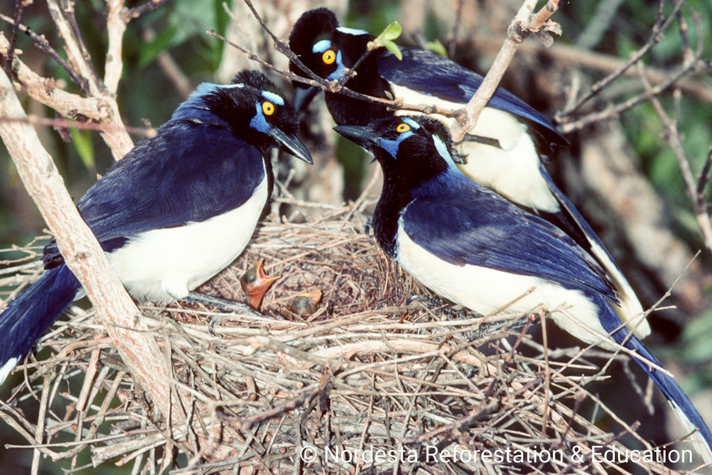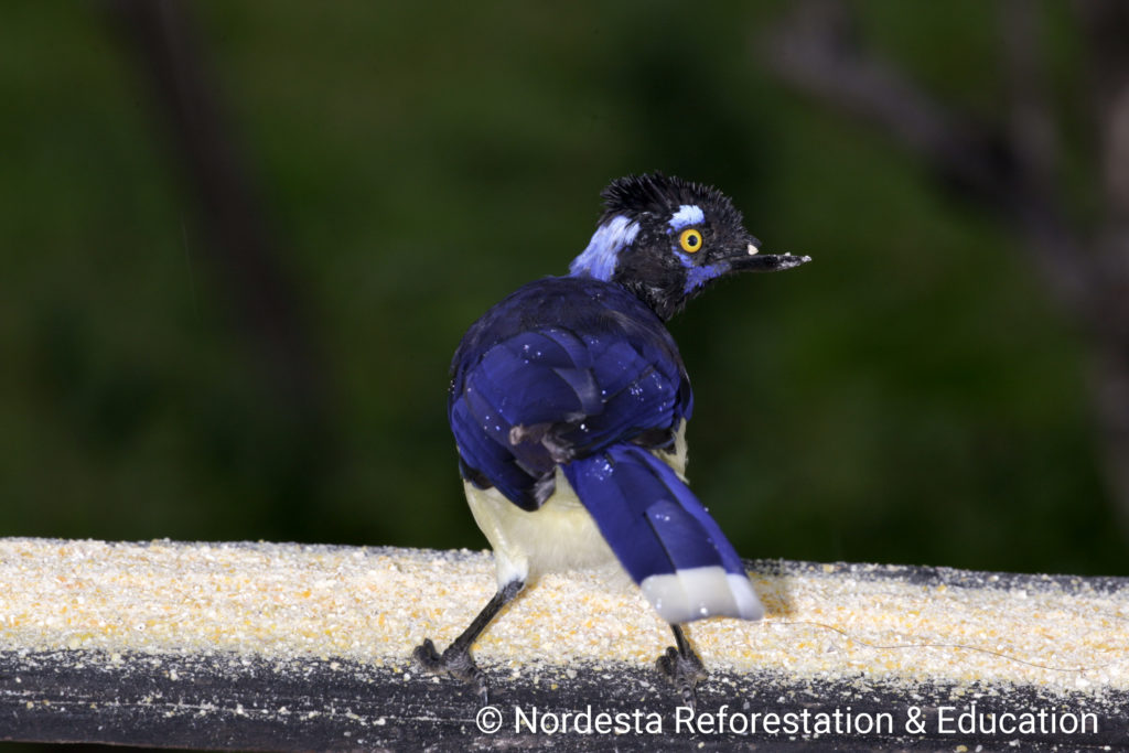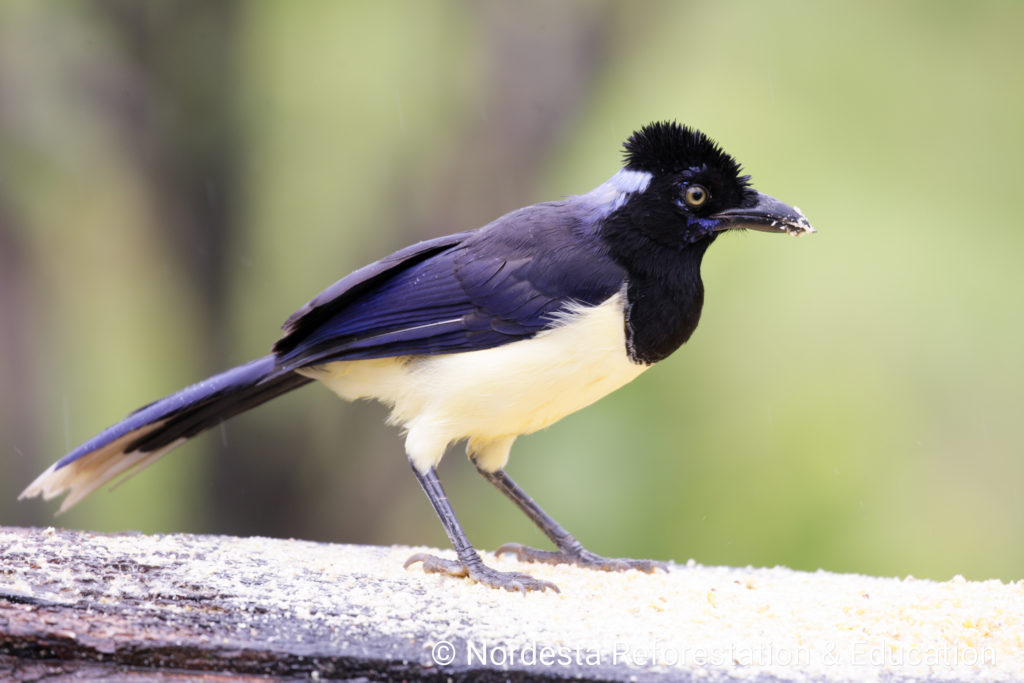 The Plush-crested Jay is a highly social and intelligent bird, often seen in flocks of 5 to 15 individuals. It shows practically visual differences between males and females and is known for cooperative breeding—some adults help raise the chicks of other pairs. Its diet is omnivorous, including insects, small animals, fruits, seeds, eggs, and even carrion or human food waste. Chicks are primarily fed insects.