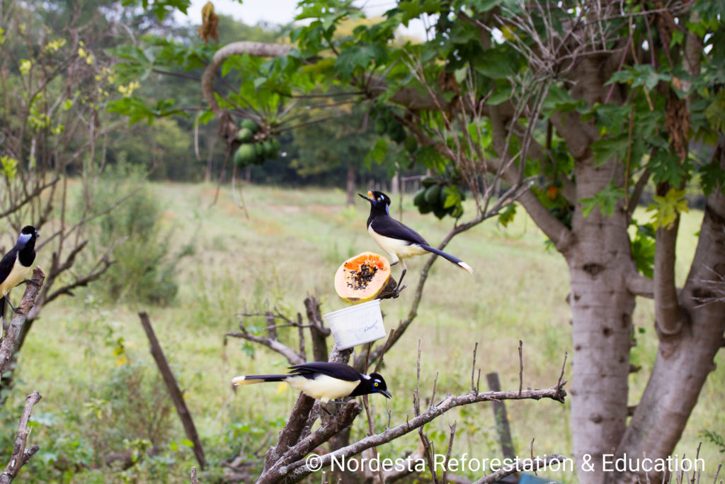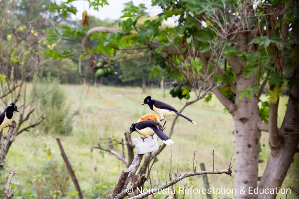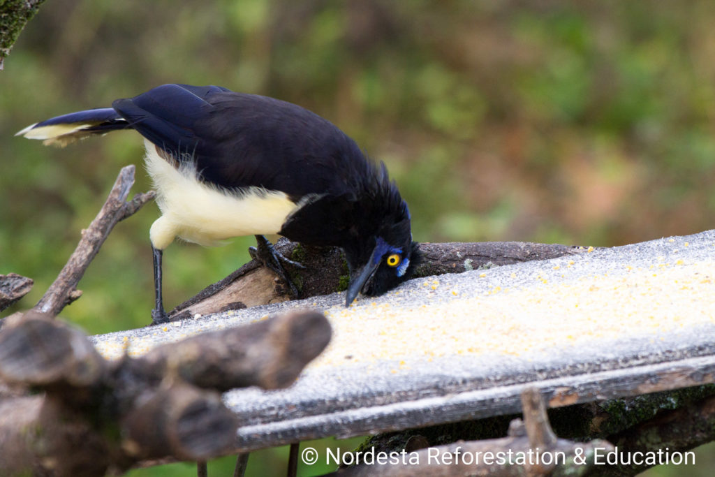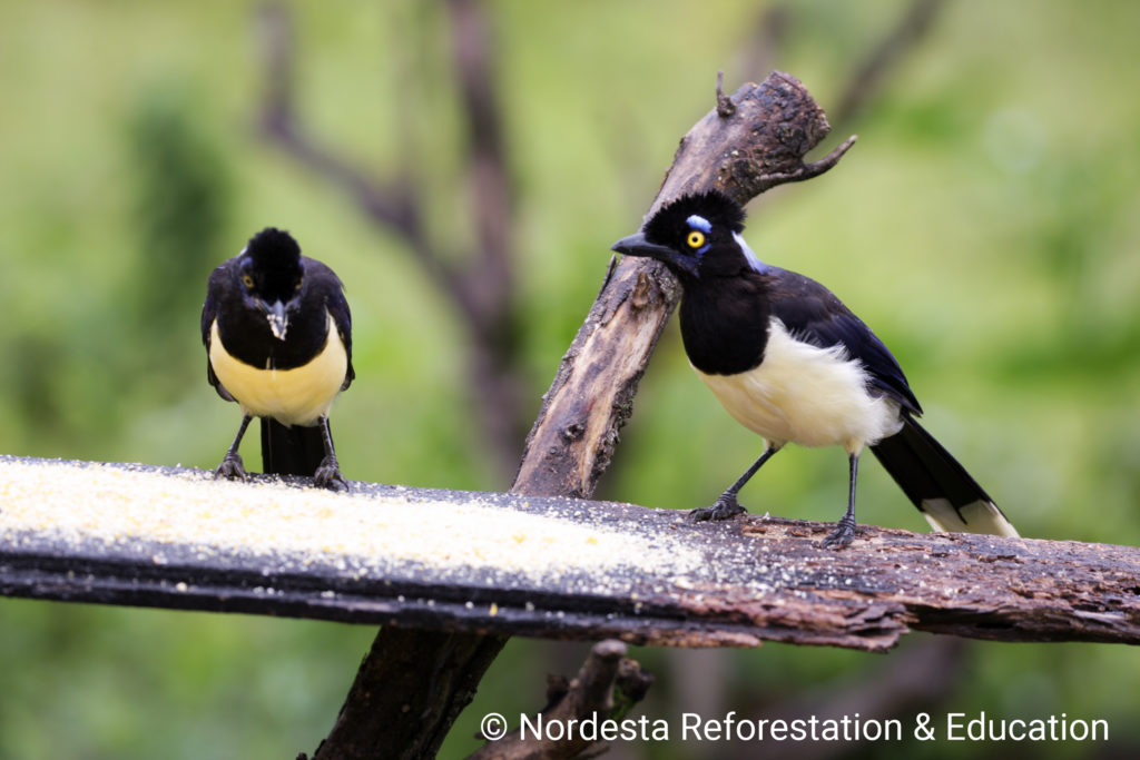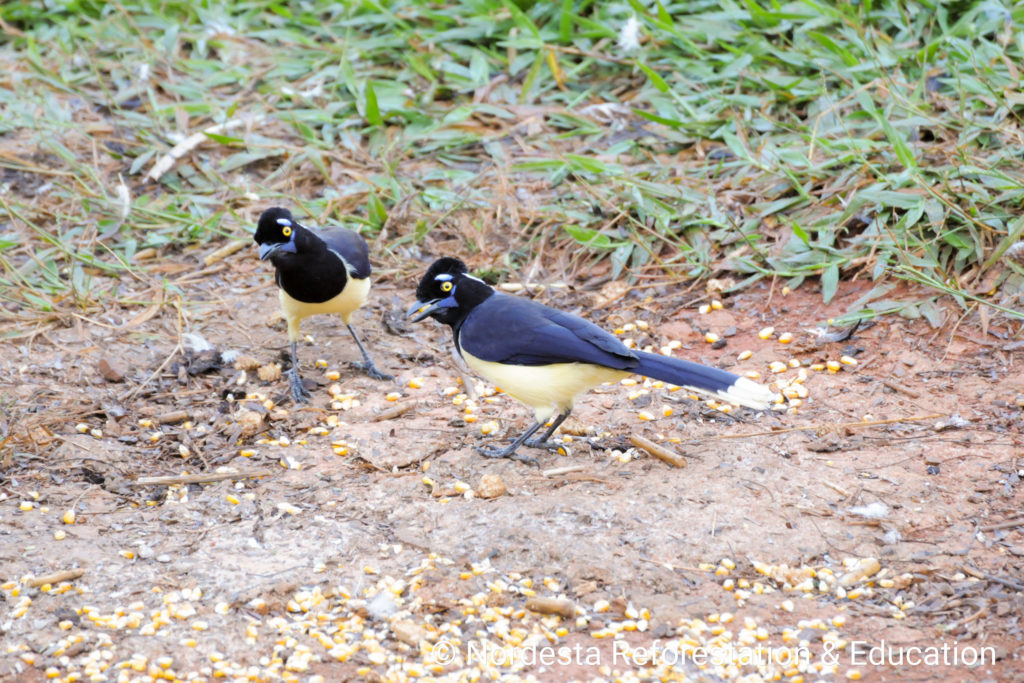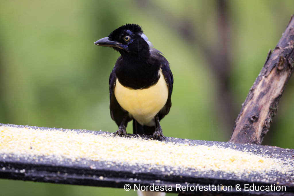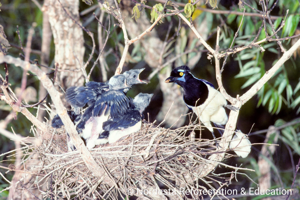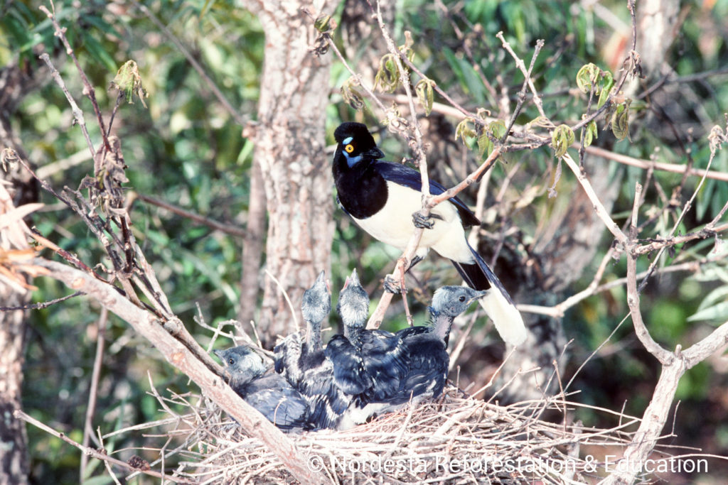 The Plush-crested Jay is a highly social and intelligent bird, often seen in flocks of 5 to 15 individuals. It shows practically visual differences between males and females and is known for cooperative breeding—some adults help raise the chicks of other pairs. Its diet is omnivorous, including insects, small animals, fruits, seeds, eggs, and even carrion or human food waste. Chicks are primarily fed insects.