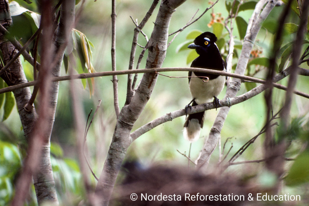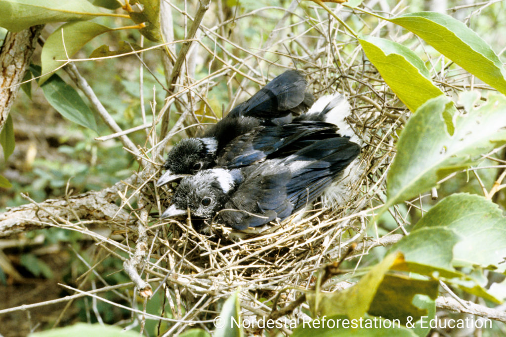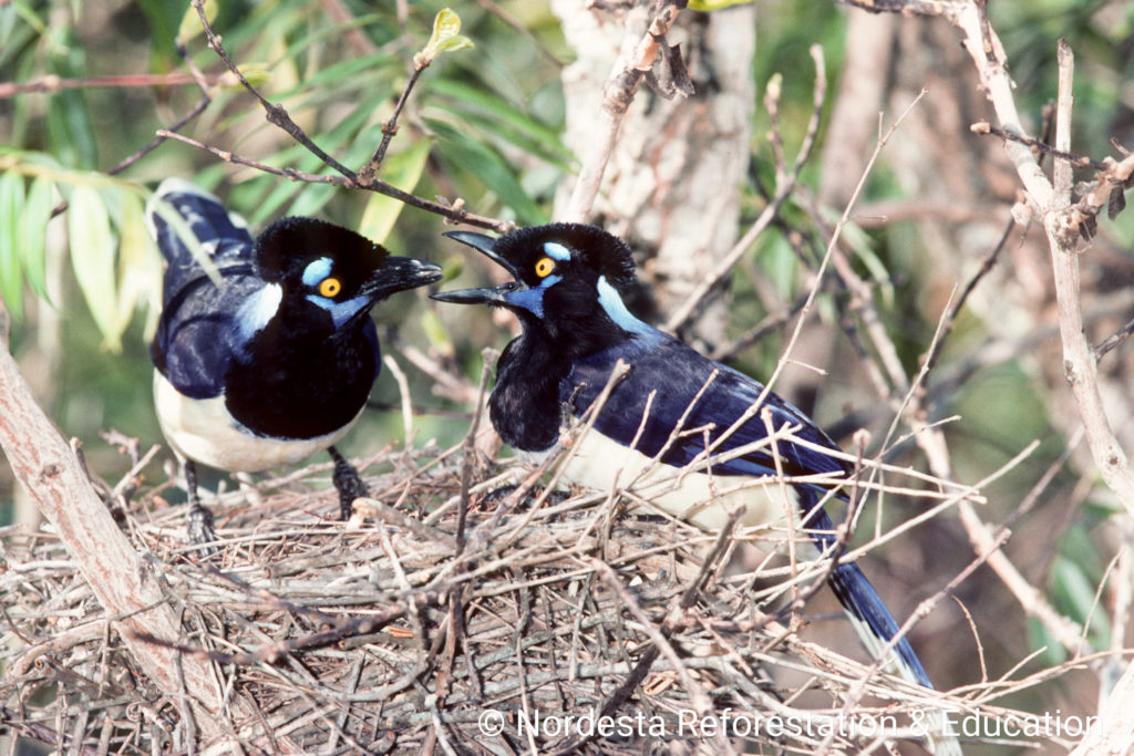 The nest is a large, platform-like structure made of intertwined twigs, built at heights between 3 to 7 meters in the forest mid-story. The inner chamber is carefully lined with leaf veins, roots, and parts of the vine Aristolochia sp. Each nest may contain materials like small forked twigs (10–30 cm), longer twigs (30–50 cm) and pieces of root or vine stems.
