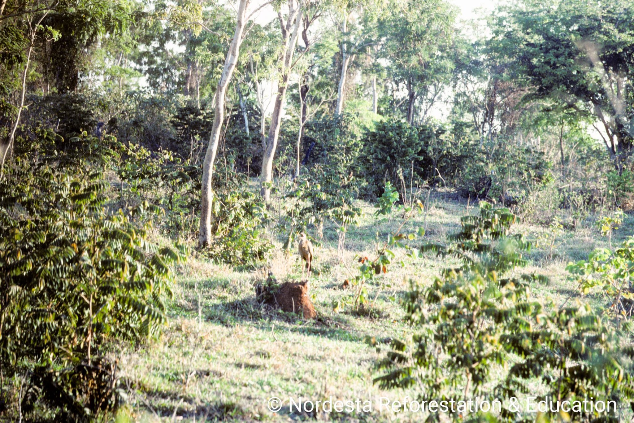 Seriemas are primarily ground-dwelling birds that forage by walking among tall grasses, shrubs, trails, and dirt roads. Their diet includes fruits, seeds, insects, lizards, small snakes, amphibians, and even small mammals, which they kill by striking them against the ground. They tend to avoid flying and, when disturbed, prefer to flee on foot before taking off. These birds are territorial and use loud duets, particularly during the breeding season, to communicate with neighbours and establish territory boundaries. Vocalisations often occur from elevated perches like termite mounds or tree branches.