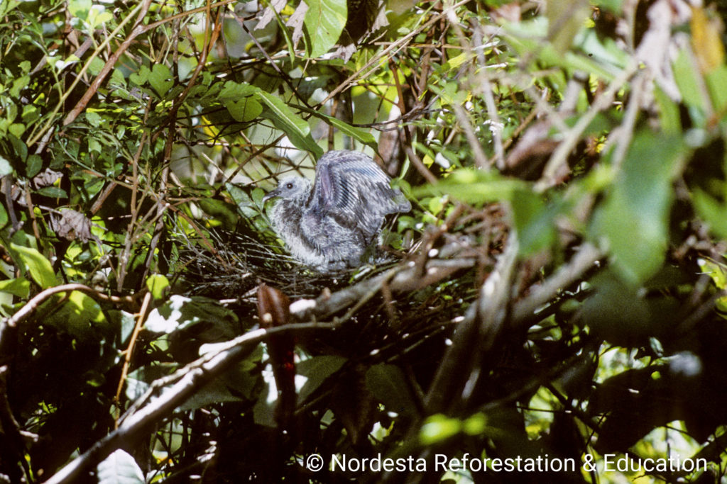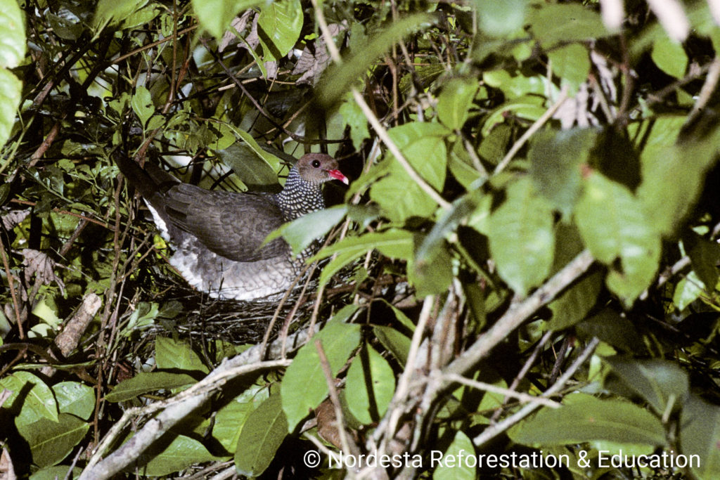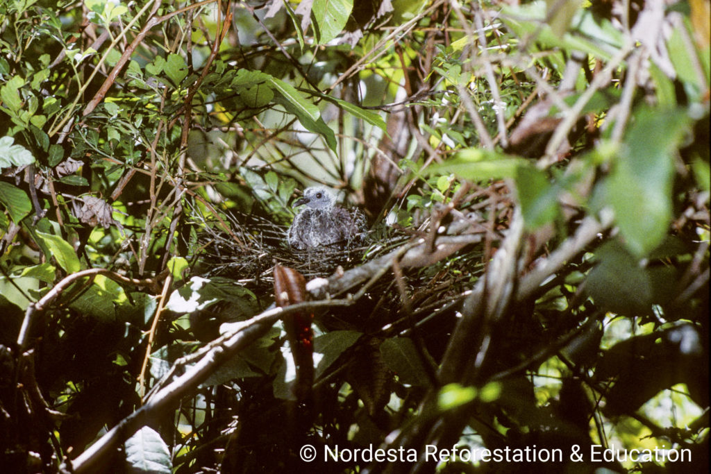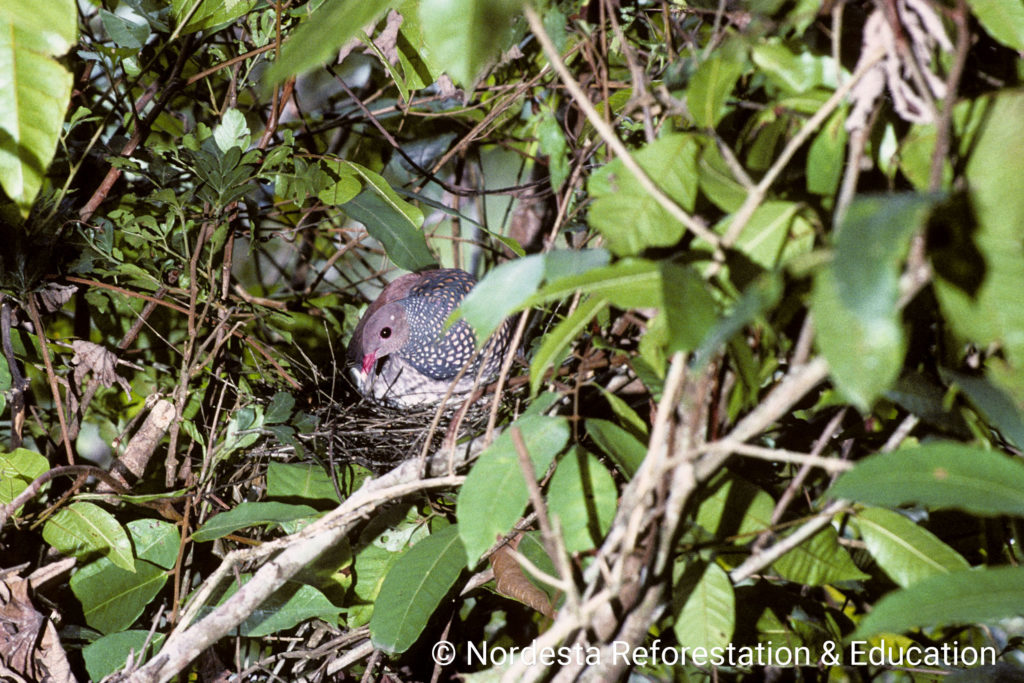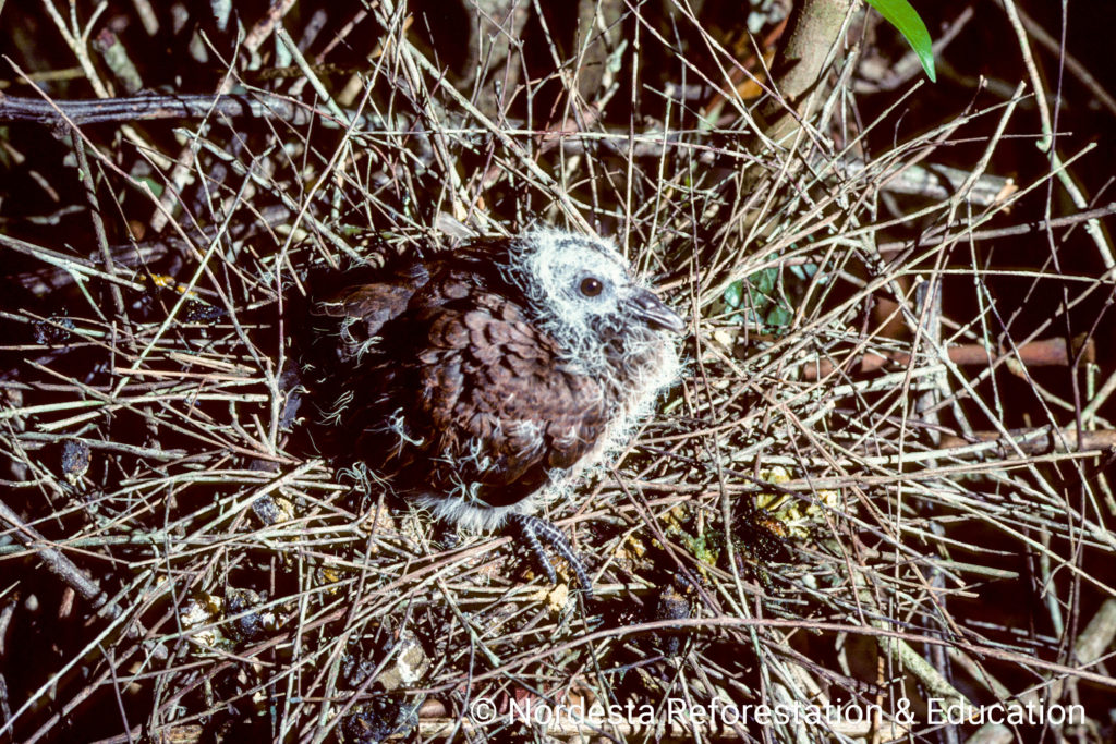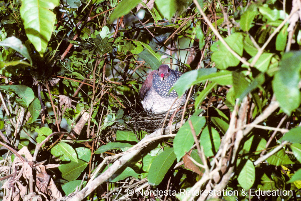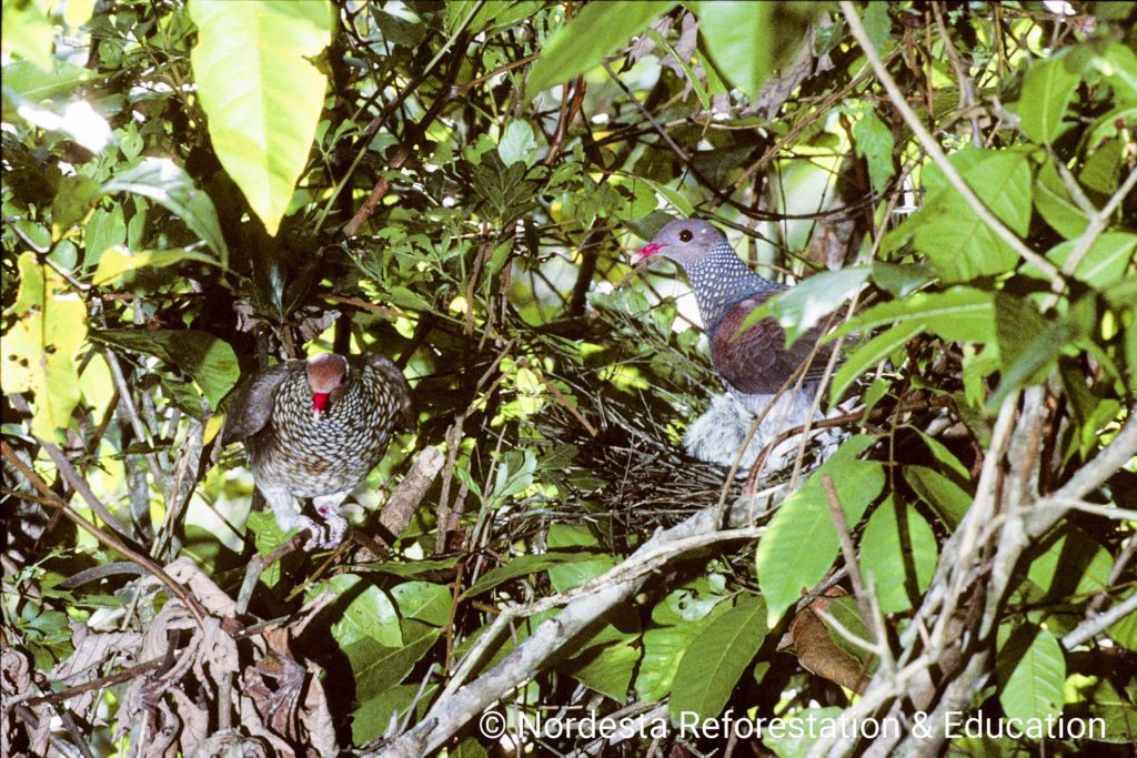 Scaled Pigeons build fragile, shallow platforms of twigs, often in vine tangles or near the tops of trees. The nests in Quebrangulo were located 7 and 12 meters above the ground. In other regions like Costa Rica, nests are often lower—between 0.6 and 4.5 meters—with occasional nests built as high as 18 meters or as low as ground level. The structure is typically loose and barely sufficient to support the eggs.
