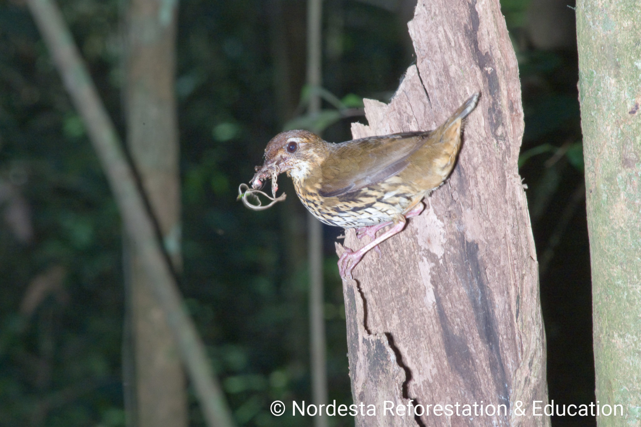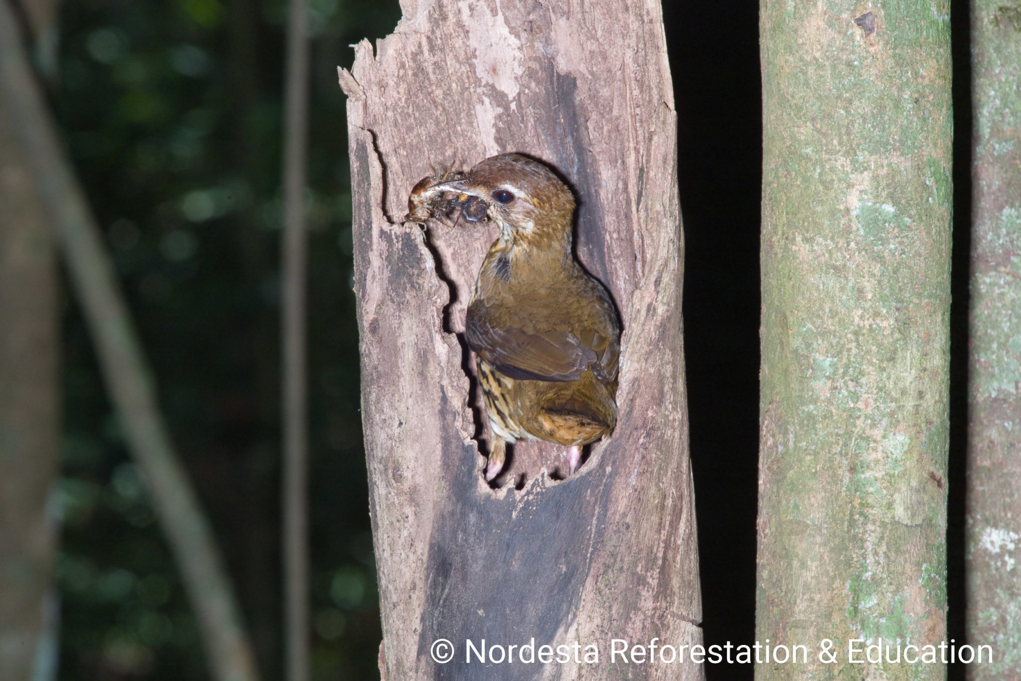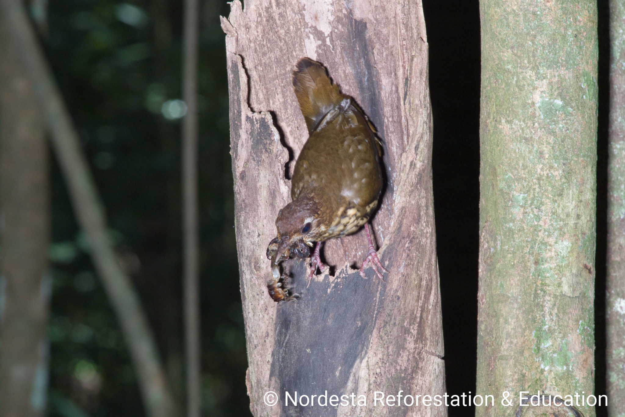 Both parents participate in raising their young. They bring mostly insects—like crickets, grasshoppers, beetles, ants, and caterpillars—to feed the chicks, along with some spiders and berries. Adults often zigzag on the forest floor and pause cautiously at the nest entrance before entering or leaving. Both parents remove faecal sacs to keep the nest clean. Feeding visits are more frequent with younger chicks and decrease as chicks grow older. In some cases, nests are reused in later breeding attempts, though it’s unclear if by the same pair.