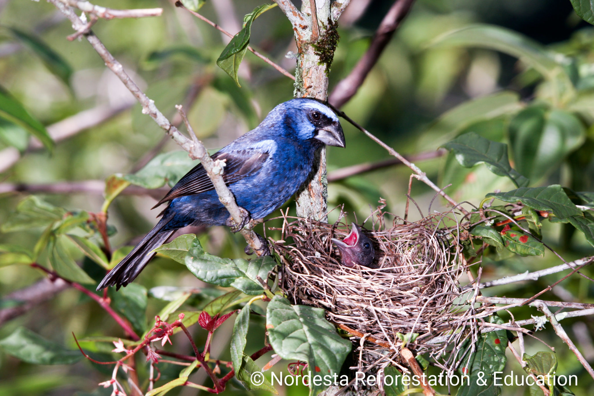The Ultramarine Grosbeak builds cup-shaped nests with thin walls made of roots, tendrils, and leaf stalks, placed at the fork of small branches. They were usually placed in forest-edge vegetation or on rocky outcrops, between 0.8 and 5.2 m above the ground in Alagoas. Common nesting plants included Psidium guineense, Vitex polygama, and Cnidoscolus urens.