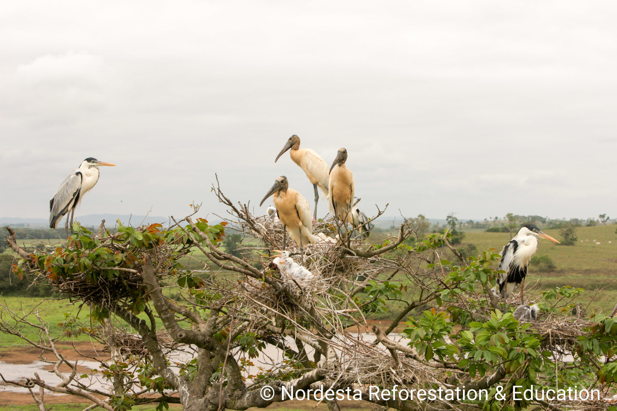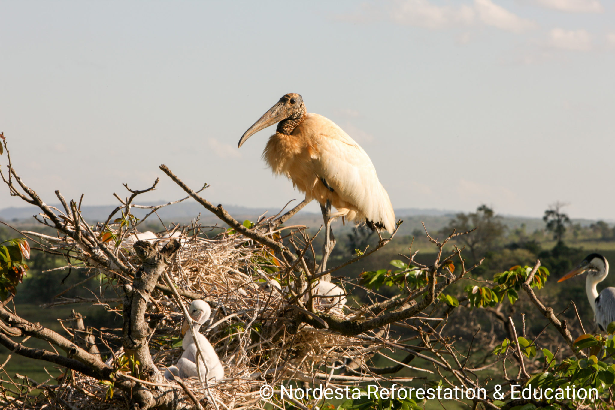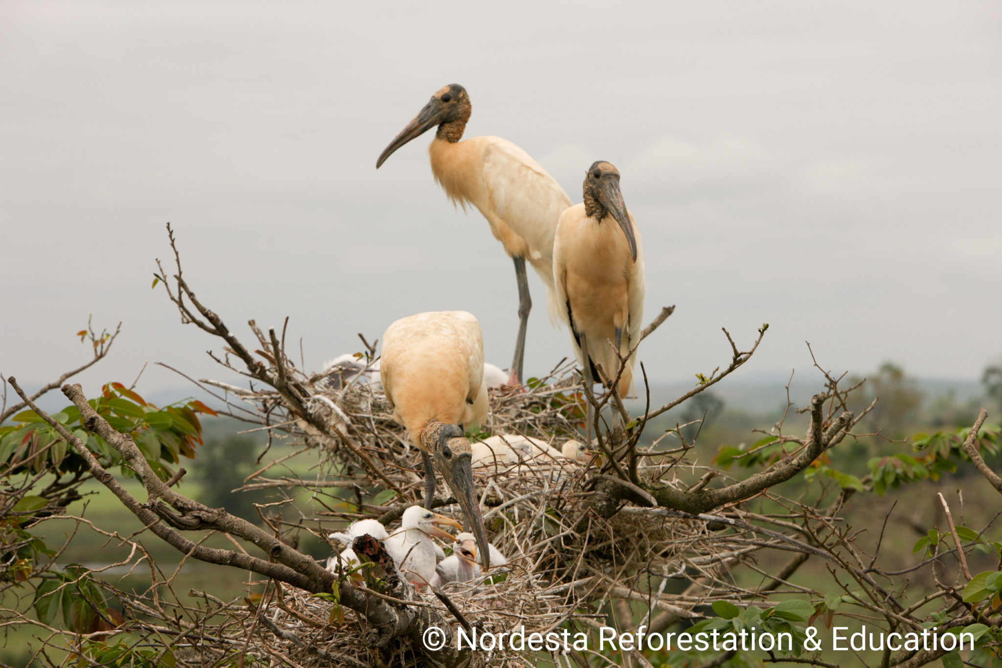 Mycteria americana builds large stick nests high in trees, often in colonies. They may nest alongside species like spoonbills and herons, sometimes just centimetres apart. Nests are reused and maintained throughout the season, with adults often bringing new branches.